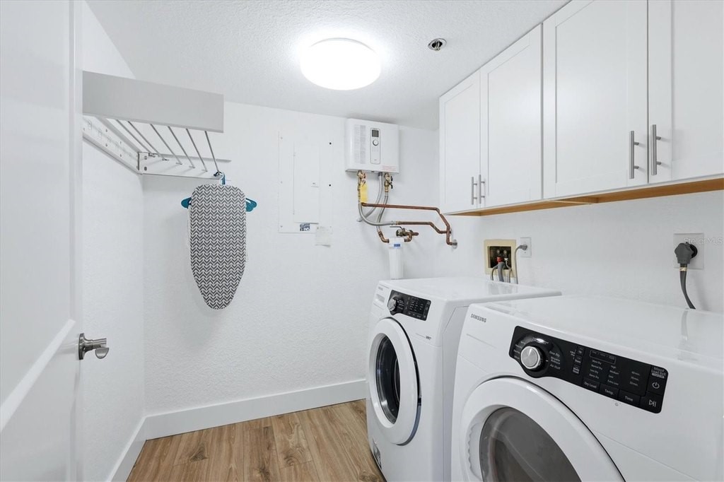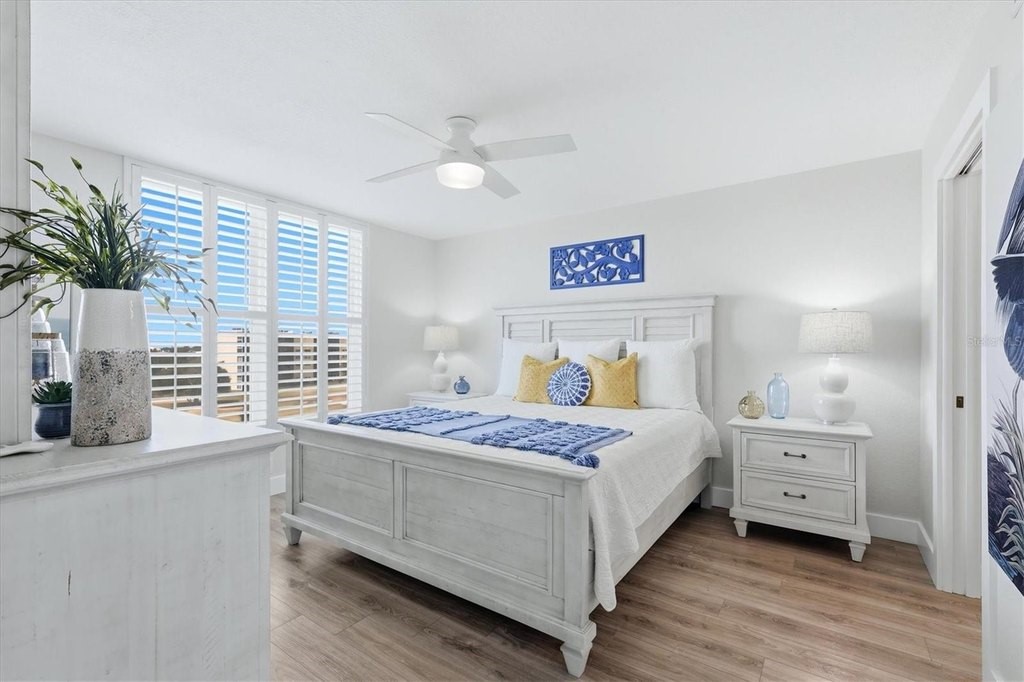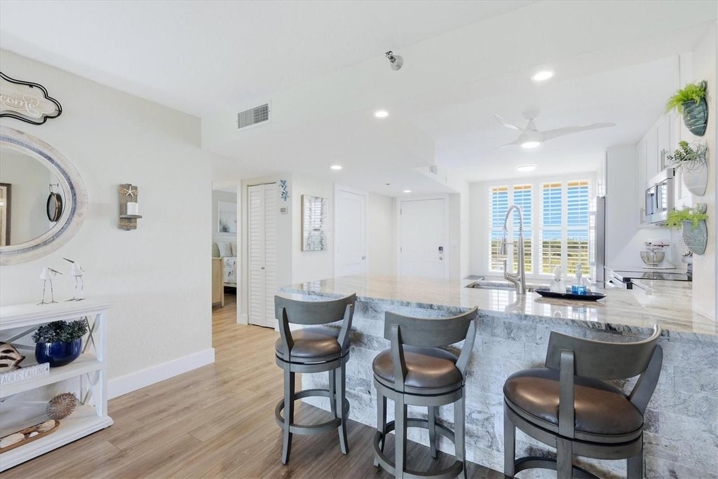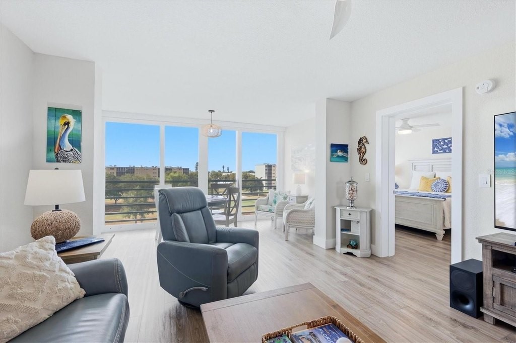 Welcome to your slice of Florida paradise, perfectly suited for those who love golf, sunshine, and a vibrant yet relaxed lifestyle. This beautifully updated condo boasts serene golf course views and an open, airy design that immediately feels like home. Step inside to a stunning, light-filled floor plan where every detail has been carefully curated. The kitchen is both stylish and functional, featuring 42" cabinetry with pull-out shelving and pot drawers, solid surface countertops, and a striking stacked stone breakfast bar that flows effortlessly into the spacious great room. A double stainless sink and modern finishes make this space ideal for both everyday living and entertaining. The upgrades continue throughout, including enhanced trim and interior doors, fresh neutral paint, and the complete removal of popcorn ceilings for a clean, contemporary look. Luxury vinyl plank flooring runs seamlessly throughout the home, offering durability with a high-end feel. Both baths have been tastefully updated, with the primary featuring a frameless shower door. Impact windows paired with plantation shutters provide both beauty and peace of mind, while the rear impact sliding doors are equipped with convenient remote-controlled shades. Beyond your front door, enjoy a lively community atmosphere with access to a clubhouse, sparkling pool, tennis and pickleball courts, and a full calendar of social events designed to keep you as active-or relaxed-as you choose. Location is everything, and this condo delivers. You're just minutes from the stunning shores of Anna Maria Island, a short drive to Sarasota-Bradenton International Airport, and within easy reach of I-75 for travel in any direction. Plus, world-class pickleball at GT Bray is less than 1.5 miles away. Whether you're searching for a seasonal getaway or a full-time residence, this condo offers comfort, style, and the ultimate in Florida living.